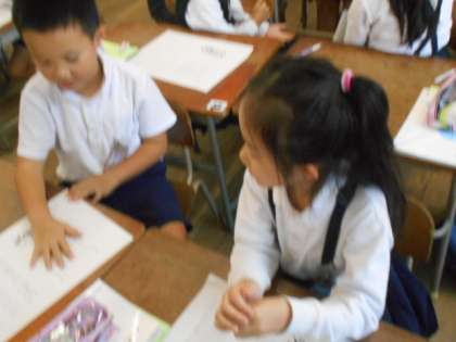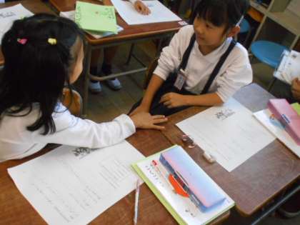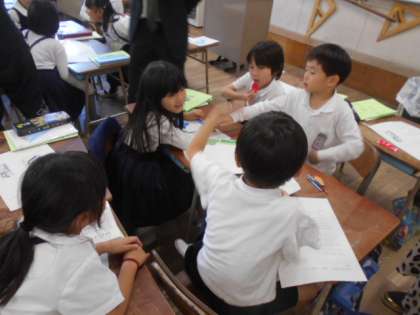 主人公の「りっちゃん」が体調をくずしたお母さんを元気づけるために「サラダ」を作ります。1−2の子どもたちも、サラダに何を入れたらお母さんが元気になるかをりっちゃんにアドバイスするという学習です。