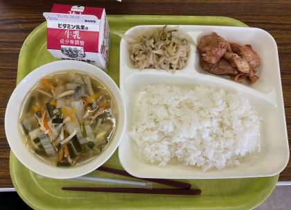 この日の献立は、鶏肉のチリソース焼き、焼き豚とワンタンの皮のスープ、切り干し大根の辛みづけ、ごはん、牛乳でした。