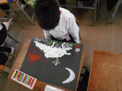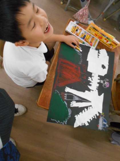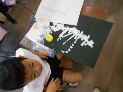 「恐竜と遊ぶ」というテーマですが、すでに恐竜を表現することで子どもたちは楽しく造形遊びをしていますね。
