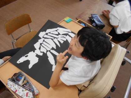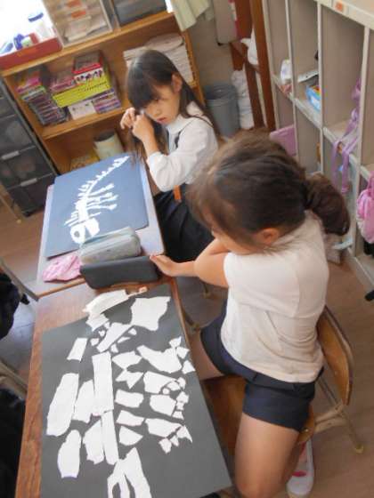 まわりの様子をクレパスで描く前に、それぞれのイメージを膨らませていました。