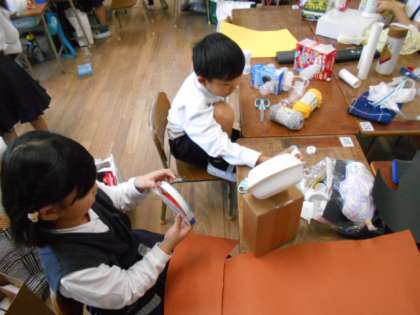 どうぶつを箱やかざりで作っています。題名も「海東ぽかぽかZOO(ズー)で決まったようです。