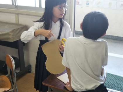 段ボールカッターを使って個性的なギターのボディを切ります。なかなか手ごわく、結構力が必要です。汗が出ます。