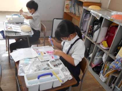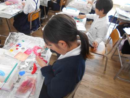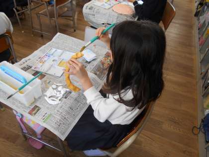 お面の顔の部分の下地を塗り終えて、今度は各部分のパーツの色を塗っています。