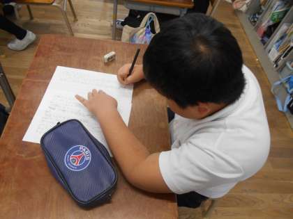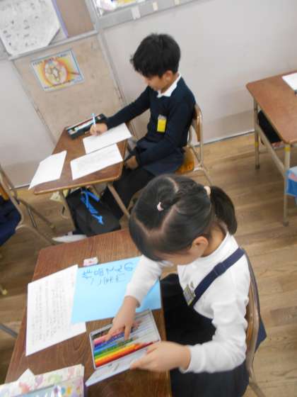 作品展の招待状を作成中でした。「いつもご飯を作ってくれてありがとう。」とか「いつもお仕事をがんばってくれてありがとう。」というメッセージとともに家族への招待状を書いていました。