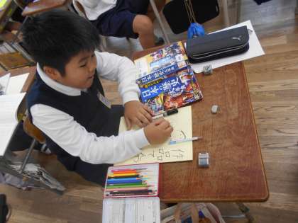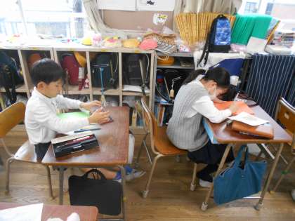 これは・・・フラスコの中の空気が暖められると体積が( )え、冷やされると体積が( )むからと子どもたちは気がついたようです。