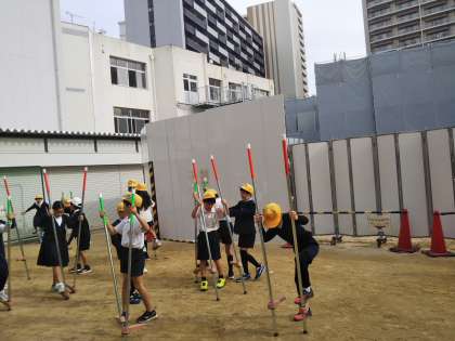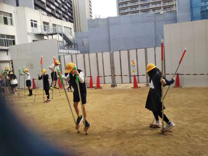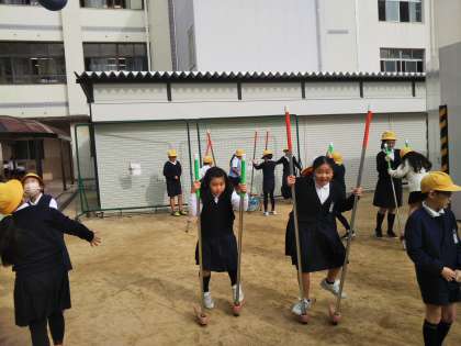 研究助成金で購入した竹馬や一輪車を使って、運動場で元気に遊んでいました。