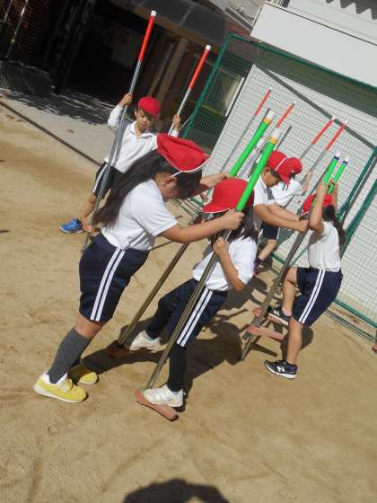 2年生が、バランス系の体育用具を使って体育を学習していました。