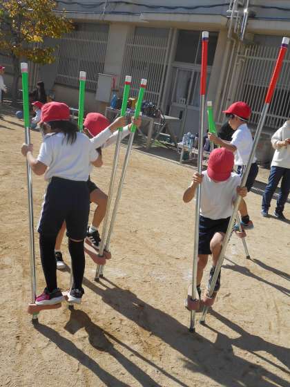 3グループに分かれて竹馬、一輪車、ペダルに取り組んでいました。