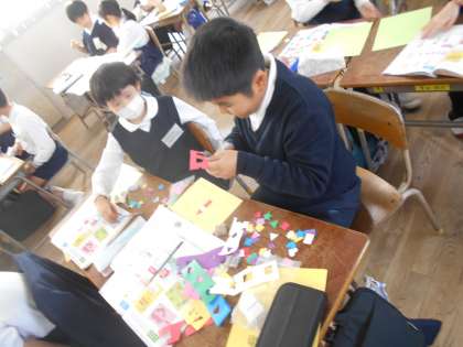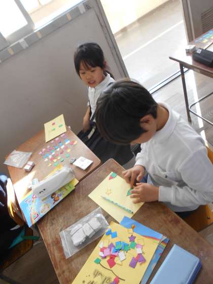 色と形が違うカードを用意して、What do you want? I want red triangle.(あなたは、どれがいいですか? わたしは、赤い三角がいいです。みたいなやり取りをして、カードに貼っていきます。サンタさんを作っている子もいました。