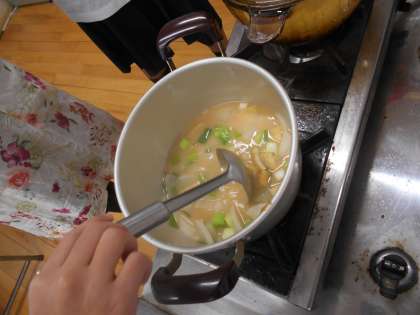 少しこおばしいおこげを作りながらごはんが炊き上がり、みそしるも完成しました。