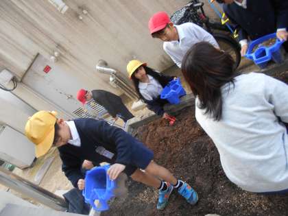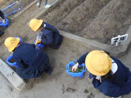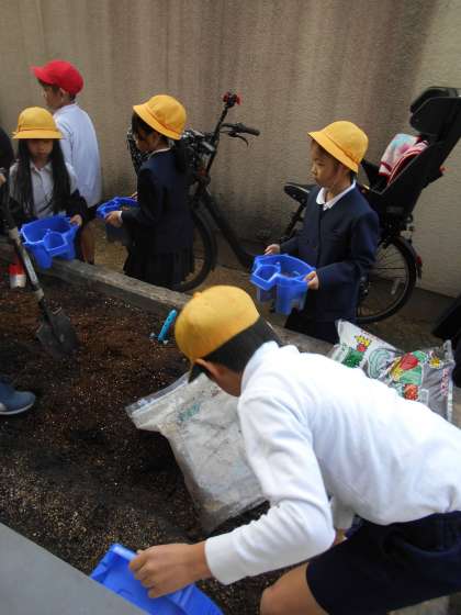 2年生が生活科で、これまで植えていたミニトマトのポットの土を入れ替えて、ラッパすいせんを植えていました。