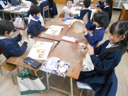 「いろいろなおとを みつけよう」というめあてで、トライアングル、タンブリン、カスタネット、すずなどをならしてみました。