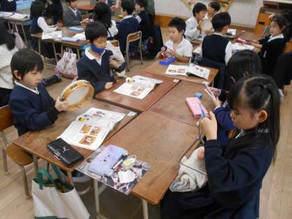 1分間自分の楽器を鳴らして、部分によって音が違うことやテンポをかえて楽しむことを試していました。1分間経つと違う楽器にローテーションしていました。