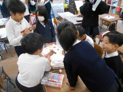 2−1で子どもたちがニコニコしながら、お楽しみ会(クリスマス会)の準備をしていました。