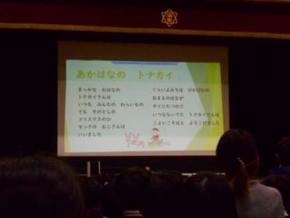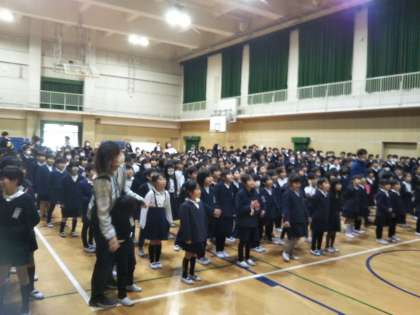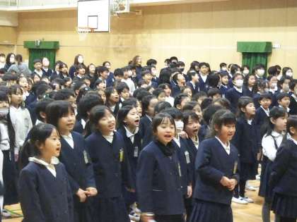 終業式のあと、全校児童と教職員が「あわてんぼうのサンタクロース」「赤鼻のトナカイ」「お正月」などの歌を講堂いっぱいに声を響かせて締めくくりました。