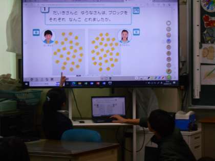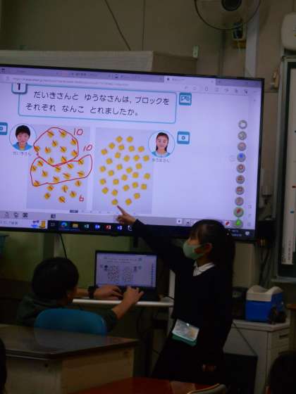 一つ一つのブロックに数字を書きながら、もれなく数える子、2のかたまりで数える子、5のかたまりで数える子、10のかたまりで数える子・・・いろいろなアイデアを考えていました。