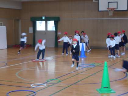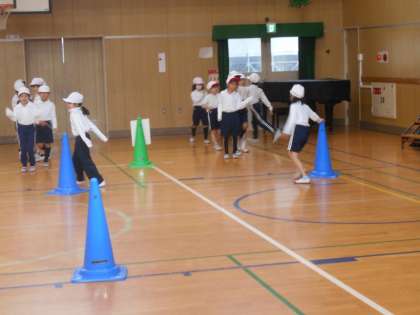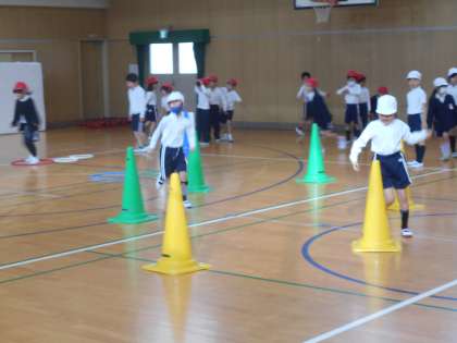 フープを跳んだり、リズミカルに走ったり、コーンをとび越えたりいろいろな動きを楽しんでいました。