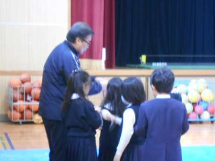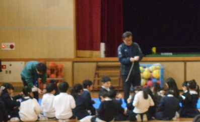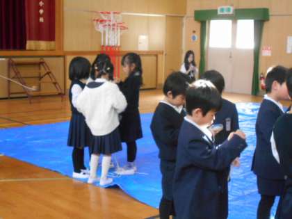 1年生がせいかつかでコマ回しと羽子板にチャレンジしました。