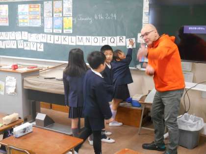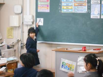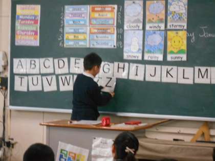 1年間の月の英語の言い方、曜日、お天気などを学習したあと、一人1枚配られたアルファベットのカードを順番にAからZまで順番に黒板に張っていきました。