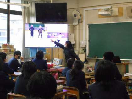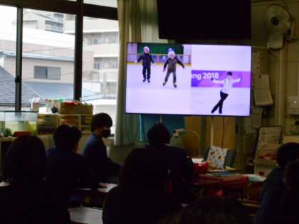 英語の授業は、「Can you 〜」などの「〜ができますか?」という表現の学習でした。羽生選手などの画像を使って、親しみやすく教えていただきました。