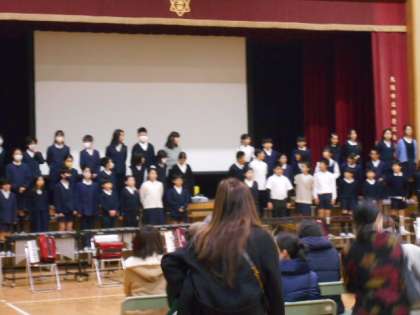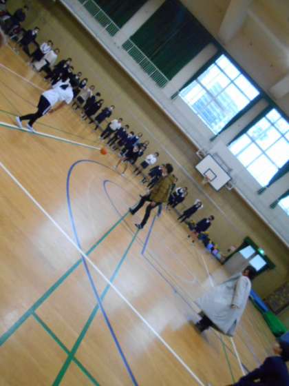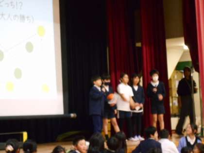 5年生の「共に1年間をふりかえろう」です。体育のグループの発表では、子どもチームがパスを回して、大人チームが1分以内でとることができるか?というクイズでした。大人チームがさすがの力を発揮しました。
