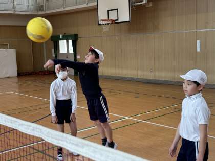 4−2の体育です。「キャッチバレーボール」の学習をしています。ネット型のゲームですが、バレーボール型ですが、キャッチを入れながら、3回以内で相手コートに返します