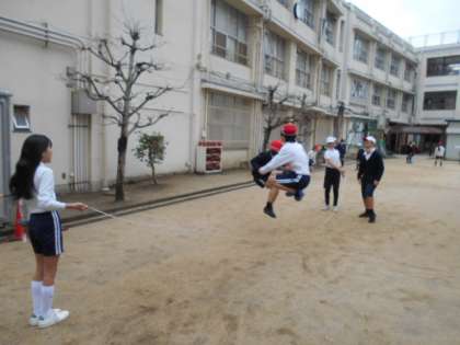 5−1の体育で。長縄を使って様々な跳び方にチャレンジしながら、たくさん回数が跳べるように工夫を重ねていました。