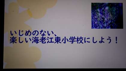 「海老江東小学校には、いいところがたくさんあります。でも、もっと、いじめのない楽しい海老江東小学校にしましょう。」と語りかけ、イラストを見ながら、いじめにはいろいろな様態があること、いじめなどの場面を見かけたらどうできるのか、教室のみんなで意見を出しながら考えました。