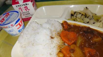 今日のメニューは、「牛肉と大豆のカレーライス」「キャベツのひじきドレッシング」「ヨーグルト」です。