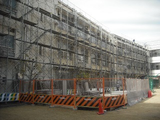 11月12日(木)今週初めから西校舎の外壁補修工事が始まりました。本校の西校舎は建築年数が40年を越え、校舎の外壁はコンクリートの表面にひび割れや色褪せも見られました。今回の工事でその辺りの補修が行われます。下の写真のように足場が組まれ、その準備ができ上がりつつあります。工事完了は来年2月ごろです。業者の方には、安全を最優先にしてもらい、期間中は音が出たり、暗くなったりしますが、きれいな校舎に生まれ変わるため、子ども達にも少しの間辛抱してもらうことになります。