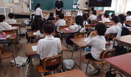 何人かの人が、前でリハーサルをしました。「何年前にできましたか?」「大変なことは何ですか?」順番にはきはきと質問します。見ていた子どもたちは、「礼儀正しかった」「もう少し声が大きかったらもっと良かった」など、ハンドサインを使って意見を発表していました。