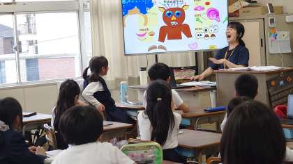 「Make a face.」に取り組んだ1組は、目や鼻、口などのパーツを選んで「Put on the