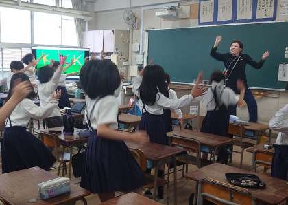 2組はアルファベット体操。アルファベットの形を体全体で表現します。音楽がノリノリで、みんな全身で楽しんでいました。