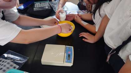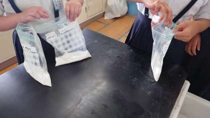 次に、水が50gをビーカーで測って入れ、少しずつ袋に入れていきます。