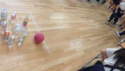 ボールを転がして、倒れたペットボトルの合計を競います。