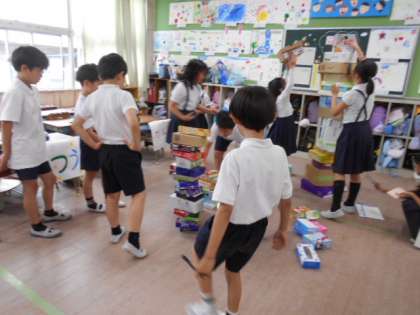 3.4班は「箱つみ」です。大きな箱や小さな箱、班で協力してできるだけ高く積み上げていきます。積み上げるだけでなくバランスも大事。リーダーがアドバイスしながら、楽しそうに積み上げていました。