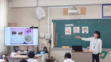 「給食に出てくる野菜にはどんなものがありますか?」福島区内の栄養教諭たずねます。子どもたちは、考えてシートに記入して行きます。後一つが思いつかない人がいたので、友達にヒントを出してもらいながら考えました。