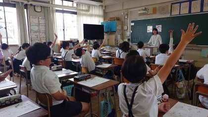 「朝ご飯を食べないとどうなる?」栄養教諭が問いかけると、子どもたちからは「しんどくなる。」「ぼーっとする。」などの意見が出ました。