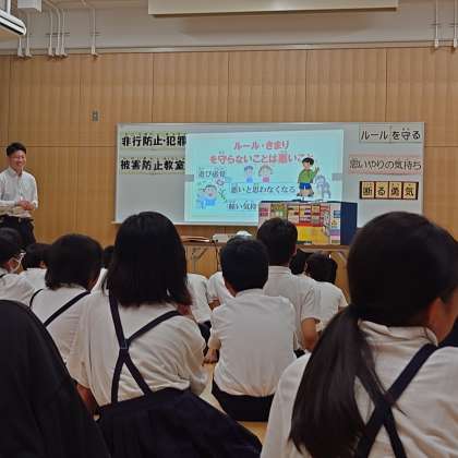 梅田サポートセンターの刑事さんたちに来ていただいて、「非行防止教室」を行いました。