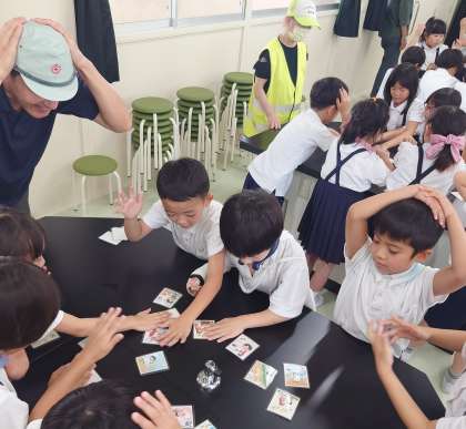 津波はすごい速さだぞ」など読み札が読み始まると、子どもたちは全集中。「はいっ!」と札を取っていきます。うまく札が取れると嬉しくてつい、おしゃべりが止まりません。2回戦していただいて、大満足したようでした。