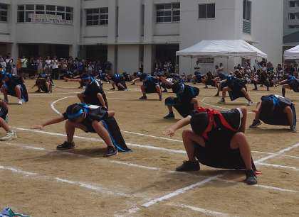 5.6年生団体演技「万丈ーそして舞い立つー」。黒いはっぴ姿で登場してきた子どもたちみんなの表情は、気合で輝いていました。「ソーラン、ソーラン!」と威勢のいい掛け声をかけながら体いっぱい動かして踊ります。一人一人の熱い思いを、会場の誰もが感じ、涙を浮かべてくださる保護者の方々もおられました。