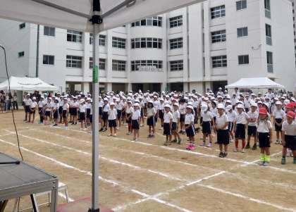 薄曇りですが、涼しくなった秋の空のもと、今年も鷺洲小学校お借りして、運動会を開催しました。