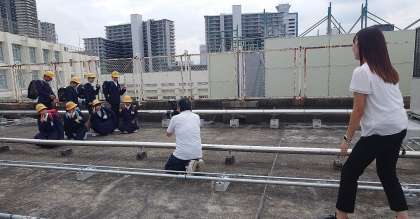 こちらのグループが選んだ場所は、北校舎の屋上。6年間背負い慣れたランドセルを背負ってみんなでポーズ。カメラマンの後ろでは、担任がみんなの緊張をほぐすために、明るい声で「いい表情だよ。いいね!」などど声をかけています。