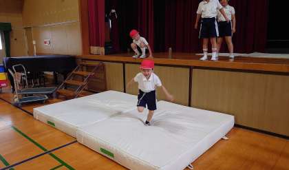 踏み板をタイミングよく踏んで跳び上がる、柔らかい着地する、縦に2つ並んだとに箱の上に開脚で乗っておしりで移動する、馬跳びでタイミングよく連続で跳ぶなど、工夫がいっぱいのサーキット!