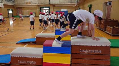 2年生は、講堂で2クラス一緒にとび箱の学習をしました。