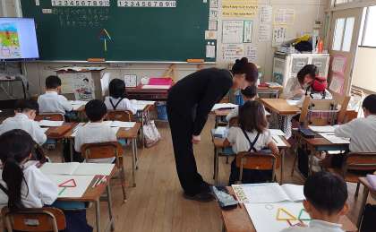 今日は、1年2組にたくさんの先生方が参観にきました。前時には、三角の色板を使って形を作りましたが、今日は棒をつないで、いろいろな形を作ります。