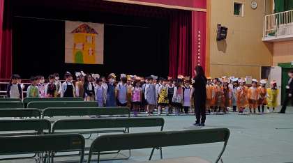 リっちゃんやいろいろな動物たちになりきって、お芝居や歌で発表します。「まだまだ、素敵な声が出ますよ」と先生。明日も頑張って練習します!