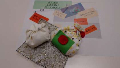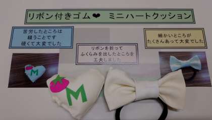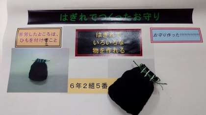 これまで、家庭科で作ったエプロンやナップサックなどのはぎれを使って、小物を作りました。