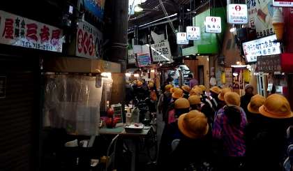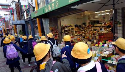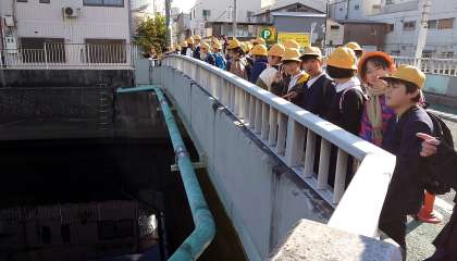 たくさんの海産物や乾物が並ぶ鶴橋商店街を通り抜け、まっすぐ長い「平野川」を見学しました。氾濫が絶えなかった川をまっすぐにするために、戦争中に、韓国・朝鮮からたくさんの人が連れてこられたこと等、先日、ソンセンニムが教えてくださったことを子どもたちはよく覚えていました。