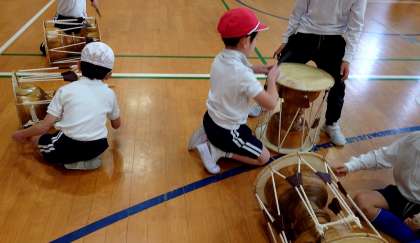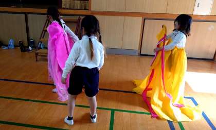 今日は1年生が、講堂に展示している朝鮮・韓国の楽器やおもちゃ衣装など触ったりして楽しみました。